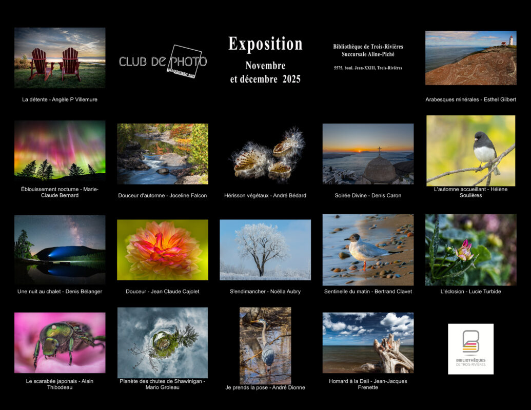 Du 28 au 31 mars 2019, le Club de photo mauricien tiendra son exposition phare de l’année! C’est dans le cadre du Salon du Livre de Trois-Rivières 2019 au Centre des congrès de Trois-Rivières que vous aurez l’occasion d’admirer les photos des membres du Club! Comme par les années passées vous pourrez voter pour votre photo coup de cœur et ainsi courir la chance de gagner cette photo encadrée!